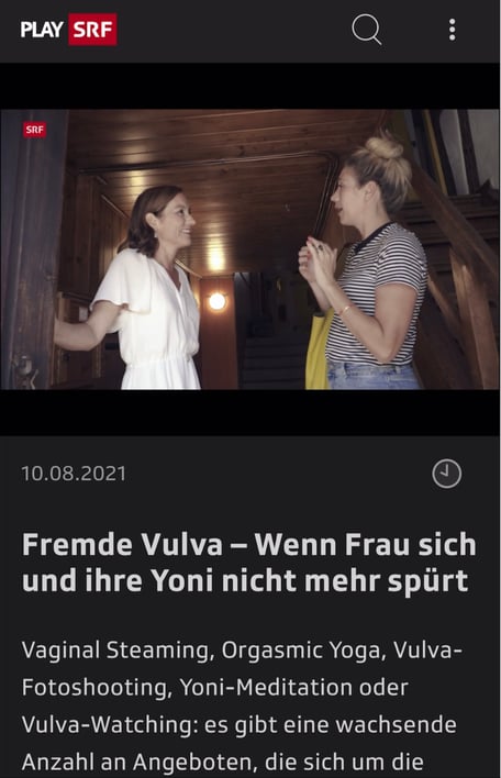 Hier findet ihr den Link zur Doku: rec. - Fremde Vulva – Wenn Frau sich und ihre Yoni nicht mehr spürt - Play SRF oder auf Youtube: Fremde Vulva – Wenn Frau sich und ihre Yoni nicht mehr spürt | Reportage | rec. | SRF (youtube.com)